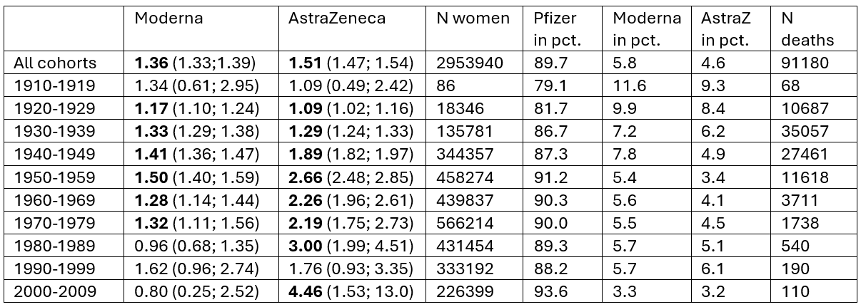 In the analyses, I also adjust for age differences and the number of doses women have received of different vaccine types. This helps reduce systematic, non-randomized differences between the groups that could exist. The dataset includes 2,953,940 women, of whom 91,180 died between 2021 and 2023. Among these, 89.7% received Pfizer, 5.76% received Moderna, and 4.58% received AstraZeneca (Note 1).